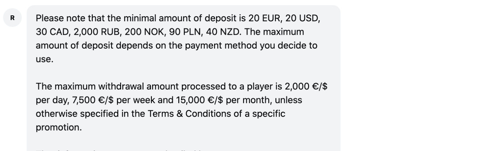 Ich habe den Kundendienst von Mason Slots zweimal über den Live Chat kontaktiert. Zuerst stellte ich eine einfache Frage zu Auszahlungslimits, um die Antwortzeiten zu überprüfen. Die Antwort war nicht sofort, aber ich musste nicht lange warten. Beim zweiten Mal wollte ich herausfinden, ob ihre Bedingungen nicht die Notwendigkeit betrafen, den Einzahlungsbetrag zu setzen, bevor eine Auszahlung erfolgen kann. Der Kundenbetreuer antwortete fast sofort und gab eine detaillierte Antwort auf meine Frage. War sie hilfsbereit und freundlich? Absolut.